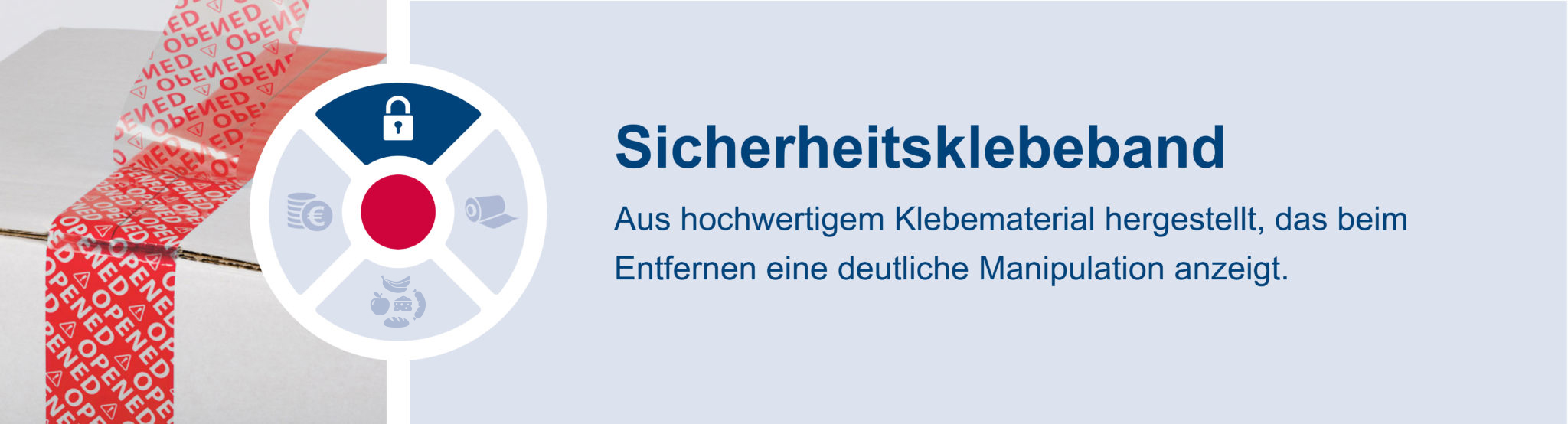 „Sicherheitsband mit hohem Rückstand“. Diese Klebebänder können wie normale Verpackungsklebebänder verwendet werden, haben aber die zusätzliche Eigenschaft, dass sie beim Abziehen des Klebebandes eine deutliche Manipulationsmeldung auf der Oberfläche hinterlassen, auf der sie angebracht wurden. Jeder Manipulationsversuch wird durch die Meldung „VOID/OPEN“ hervorgehoben, die sowohl auf dem Klebeband als auch auf der Oberfläche, auf der es angebracht wurde, zu sehen ist. Das Klebeband ist ideal für Karton, Kunststoff und Metall. Es kann mit Klebebandabrollern verwendet werden.