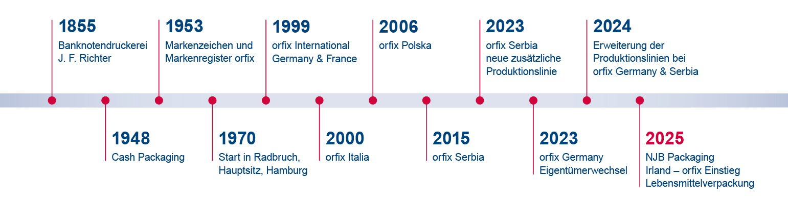 orfix International ist aus der 1855 gegründeten Druckerei J. F. Richter hervorgegangen. Bereits 1920 wurde dieser der Druck von Reichsbank-Noten zugesprochen und damit der Grundstein von einer Druckerei zu einem international führenden Anbieter für Sicherheits- und Präventionslösungen gelegt.